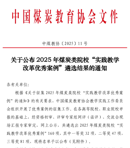 近期,我院在中国煤炭教育协会举办的2025年煤炭类院校实践教学改革优秀案例评比活动中获得职教组一等奖,获奖教师团队为靳会武、蒋梦雅、涂强、盛超、任蓓蓓老师(获奖项目名称:基于校园微基建+N教育”三阶递进式三全育人实践教学模式——道路与桥梁工程技术专业实践教学改革成果)。