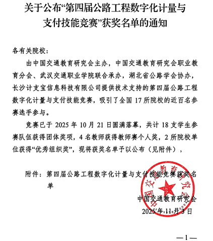近日,我院在第四届公路工程数字化计量与支付技能竞赛中获团体三等奖。(指导教师:周成龙、张伟老师;获奖学生:徐端阳、尹中臣、杜传洋)。未来我院将继续深耕实践教学,助力学子在专业赛道上再创佳绩。