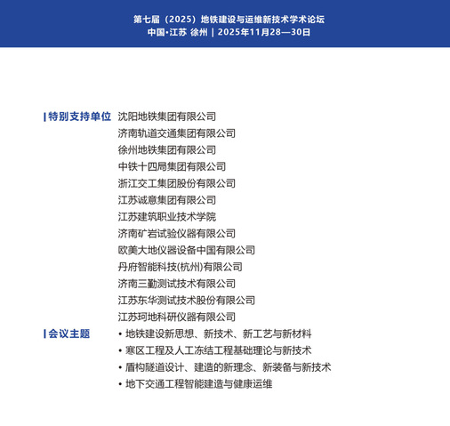 11月29-30日,第七届地铁建设与运维新技术学术论坛在江苏徐州成功举办,我院作为本次学术会议的特别支持单位参与论坛组织工作。本次论坛为了应对地铁建设与运维、地下空间开发与利用、隧道工程灾害与防治等领域新挑战,促进地铁建设技术的进一步发展,为地下交通工程的智能建造、灾害防控与健康运维提供有效策略、方案及宝贵经验,并为青年学者搭建一个创新交流的平台。