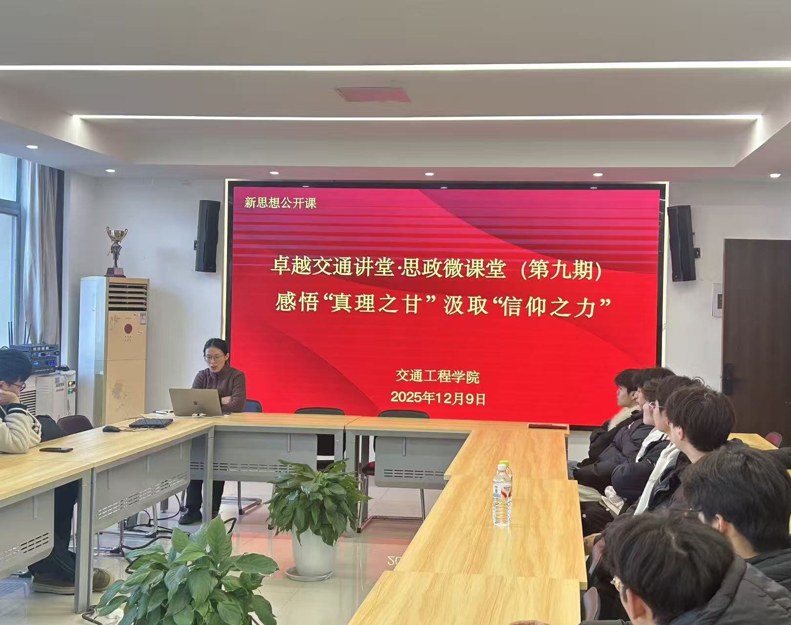 12月16日,交通工程学院在利亚楼B313举办第九期“卓越交通讲堂·思政微课堂”,主题为“感悟‘真理之甘’ 追溯‘信仰之源’”。卢龚燕老师通过生动的红色故事,带领同学们探寻马克思主义信仰的起源与力量,引导青年学子从“知”到“行”,以“强国有我”的担当投身时代洪流。