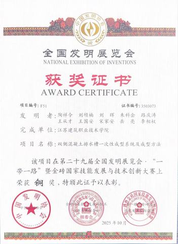 交通工程学院发明专利“双侧混凝土排水槽一次性成型系统及成型方法”参加发明展览会,并在第二十九届全国发明展览会暨“一带一路”金砖国家技能发展与技术创新大赛中荣获铜奖。该技术针对传统排水槽施工中工序繁琐、易渗漏等行业痛点,通过创新结构设计与一体化成型工艺,实现了“一次浇筑、无缝成型”,显著提升了工程质量与施工效率。